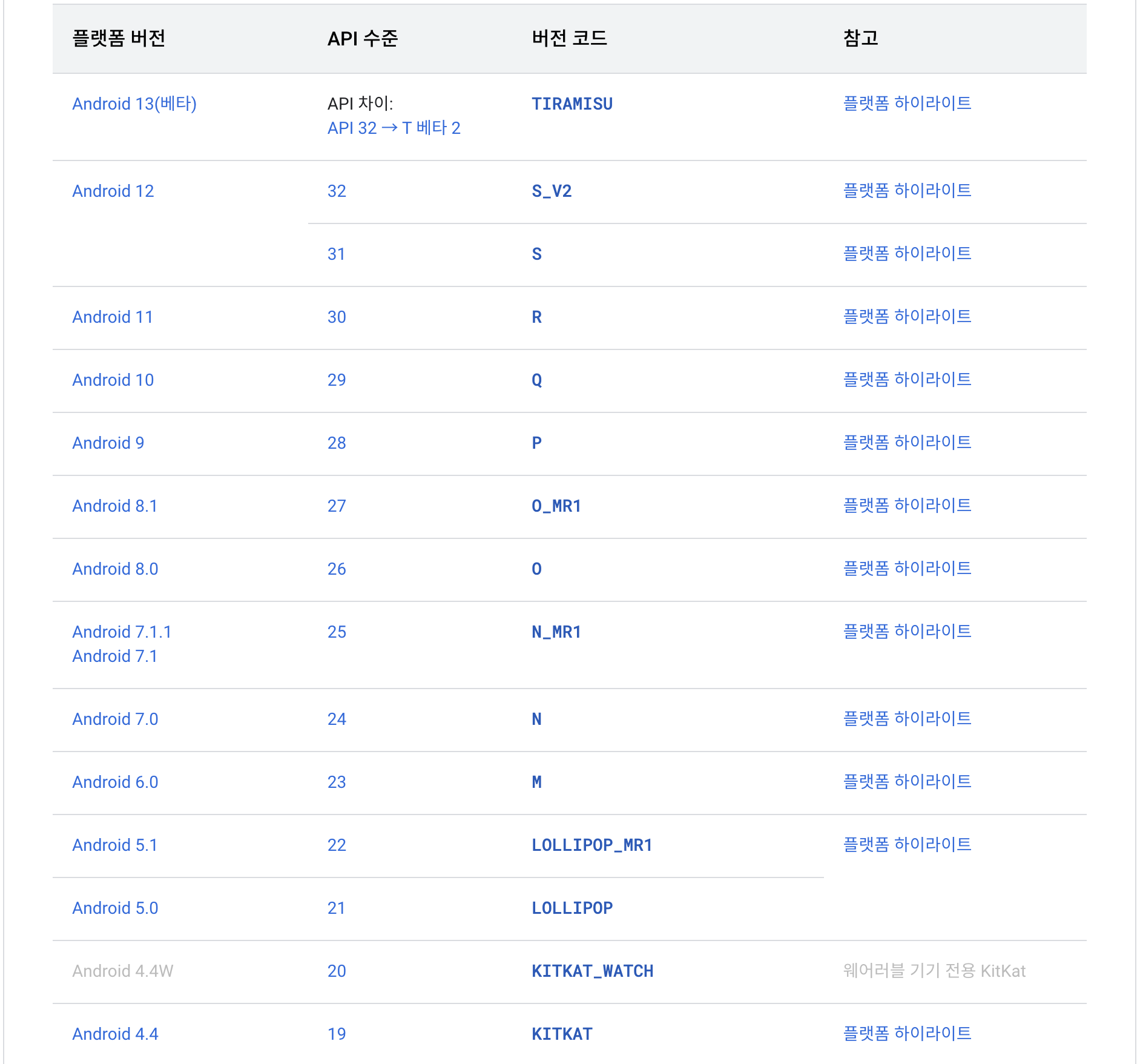 위 사진은 안드로이드의 버전별 Api 수준과 버전 코드이며 밑에 안드로이드 개발자 사이트에서 자세히 확인할 수 있다